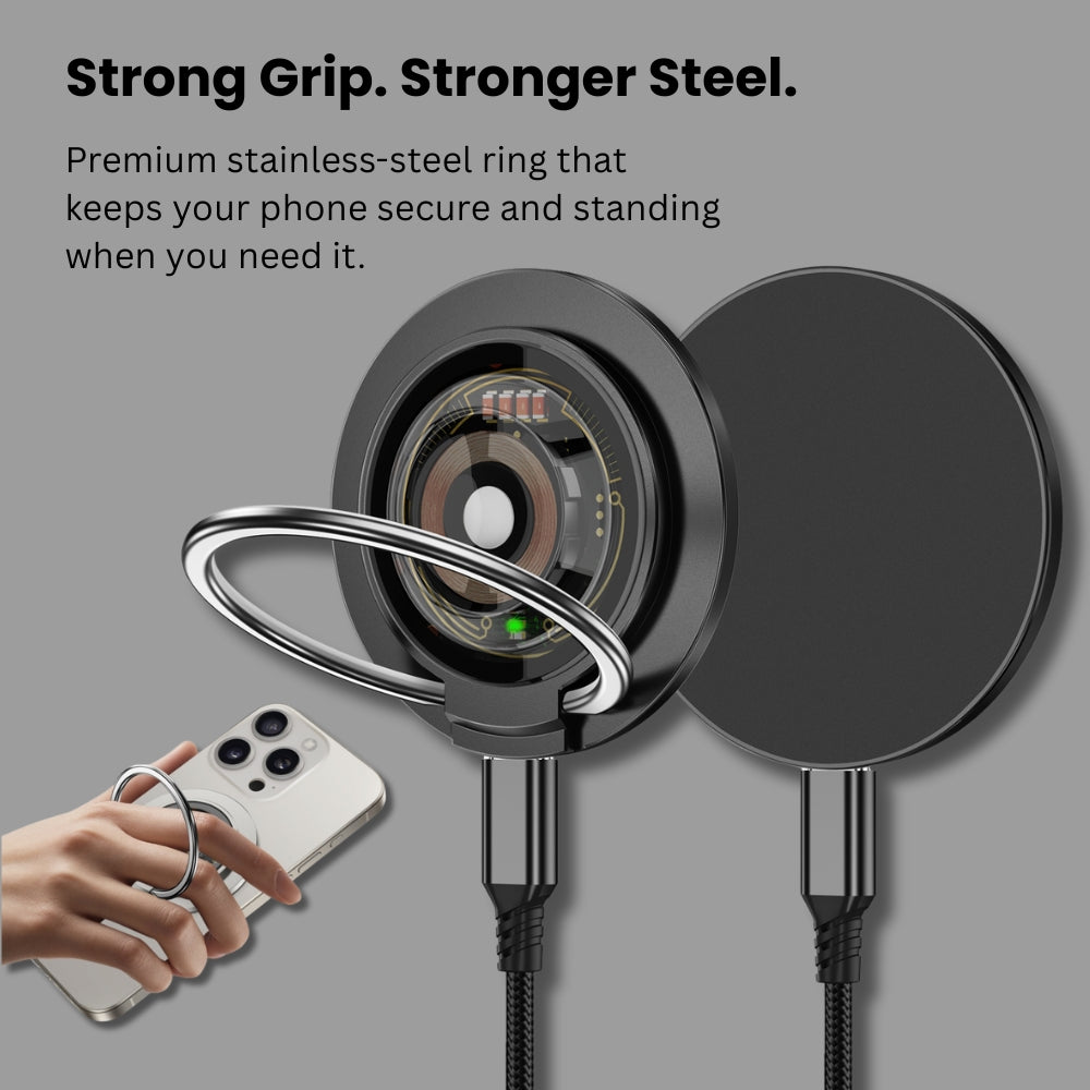 Experience the future of phone convenience. GripCharge Pro combines a 15W fast magnetic wireless charger with a foldable anti-drop ring grip, all in a sleek aluminum design built for everyday performance.
